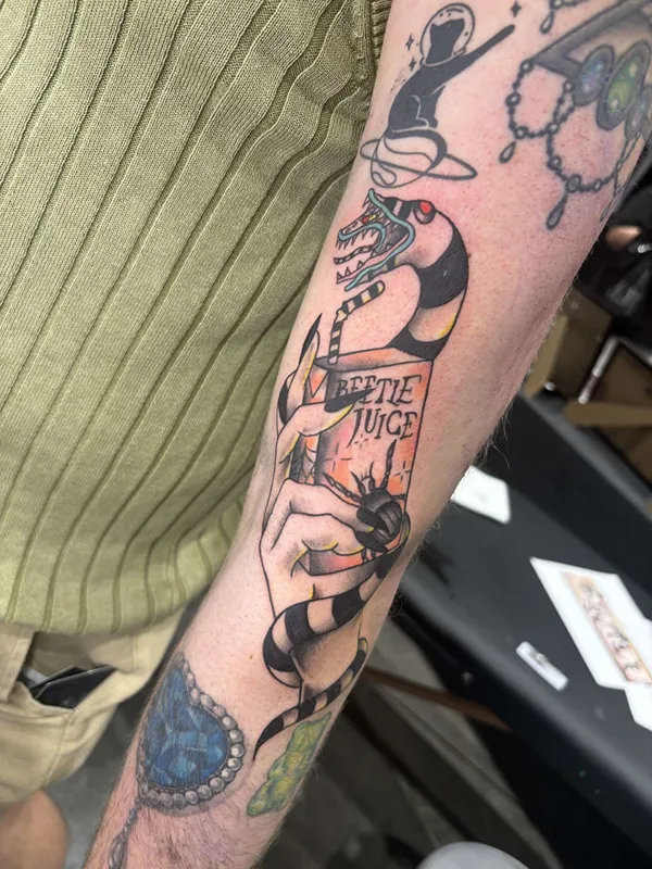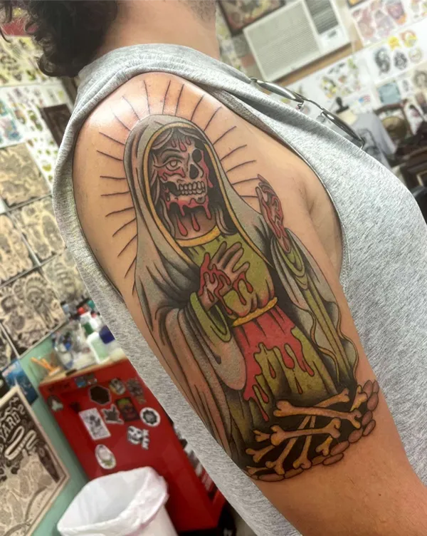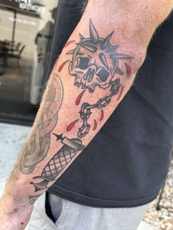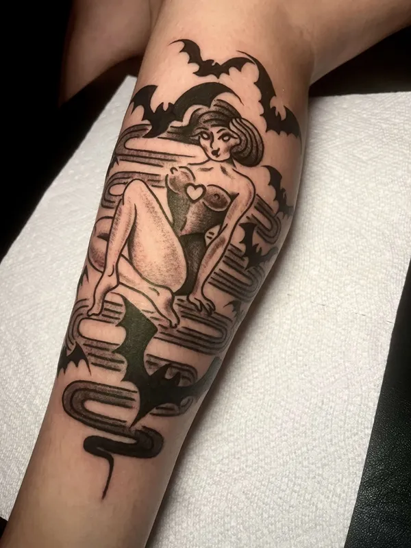 While I am flexible in all styles of tattooing, I enjoy the classic, bold, and timeless charm of American traditional tattoos in both full color and black & grey. I also love to do black & grey horror portraits, blackwork, black & grey fine line and realism, and illustrative tattoos with a spooky and creepy edge. Some other subjects I love to tattoo are pin-ups, weapons, medieval and occult imagery, Florida imagery, chicano imagery, and lettering.